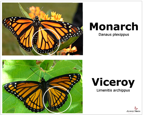Viceroys are also smaller than monarchs, though it may be difficult to tell the difference as a butterfly flies past you. Viceroys measure between 2.5 and 3.375 inches (6.3-8.6 cm), while monarchs typically measure between 3.375 and 4.875 inches (8.6-12.4 cm).