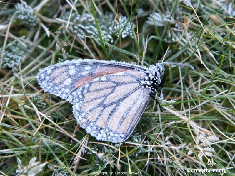 Besides the issues that falling temperatures provide directly to monarchs, migrating monarchs also rely on the right temperatures, as cold temperatures and frost can kill flowers that provide nectar along their migration route.