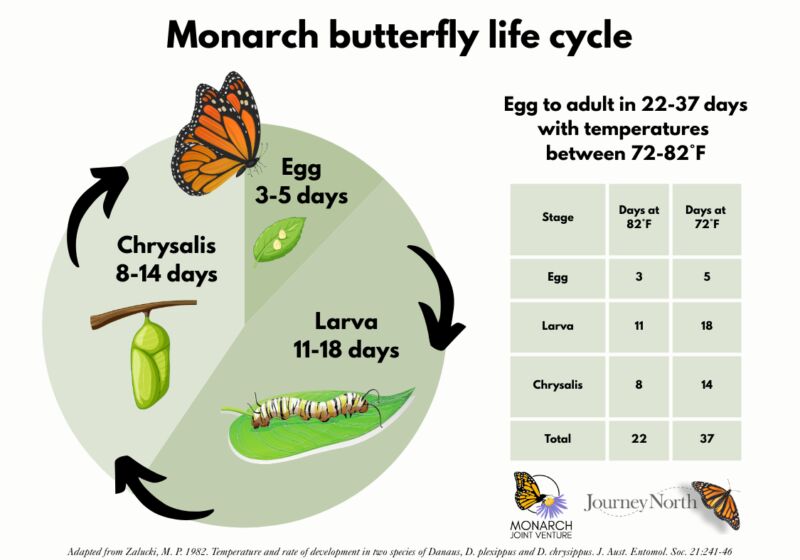 The time spent at each stage will vary based on factors like temperature. When you see a monarch egg, how long will it take before that egg becomes a caterpillar? Take a look a the graphic below, and consider how your weather may affect its development.